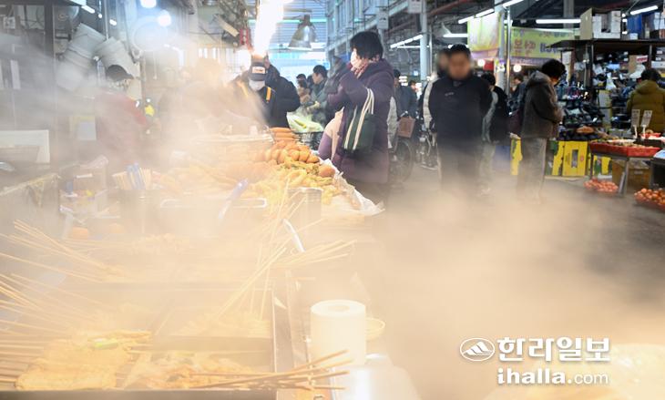 [한라일보] 7일 제주시 민속오일장 내 어묵·옥수수 좌판에서 김이 모락모락 피어오르며 시민들을 유혹하고 있다. 강희만기자