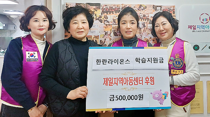국제라이온스 354-G지구 한란라이온스클럽(회장 김정림)은 8일 제일지역아동센터를 찾아 야간 돌봄사업에 참여하는 아동·청소년 학습프로그램 지원을 위해 성금 50만원을 기탁했다. 김정림 회장은 "앞으로도 지역사회를 위한 지원에 힘쓰겠다고" 말했다.