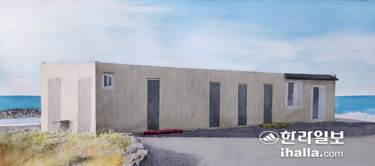 금성어촌계 건물이다. 오후의 눈부신 햇살과 짙은 바다색이 건물 뒤편에 펼쳐져 있다. 문제의식을 표현하기 위한 그림이다. 컨테이너 몇 개를 연결해 해녀들과 어부들이 사용할 수 있는 일터 공간으로 쓰고 있는 곳이다. 일부러 컨테이너 세로줄 쇠판 무늬를 빼버렸다. 그러니까 그냥 건물처럼 보인다. 금성포구 옆 매립지 위에 지은 건물이 아니라 올려놓아진 것이다. 마을 사람들의 생존의 터전 위에 스스로 건물을 지을 수 없는 이 나라의 법 때문. 해변 조간대 매립지는 국가소유로 관리되는 것이기 때문에 어떤 건축물도 지을 수 없다는 것은 마을 주민들이 조상 대대로 살아온 헌법상 행복추구권과 정면으로 충돌된다. 명백한 입법 미비를 이 금성어촌계 컨테이너 그림을 통해 드러내고자 한다. 우여곡절 끝에 어촌계를 복원해낸 불굴의 의지가 행정논리를 우선시하는 법에 의해 고초를 겪고 있는 모습이 안타까워서 그린 것이다. 상대적 박탈감이라는 것이 엄존한다. 다른 마을 바닷가에 있는 해녀들을 위한 멋있는 건물들이며 어촌계 건물들처럼 지어서 당당하게 바다를 삶의 터전으로 영위하고 싶어도 법이 발목을 잡는다면 '국민주권시대'를 표방하는 정부가 책임을 다해야 한다. 개인 기업도 아니고 마을공동체가 생업의 활용 공간을 마련할 수 없도록 제약한다는 것은 제주의 역사적 마을공동체정신에 입각해 지탄의 대상이다. 소망을 담고 그렸다. 가까운 어느 날에 법적인 문제가 해결돼 마을 주민들이 지은 어촌계 건물을 다시 그리러 와야겠다.