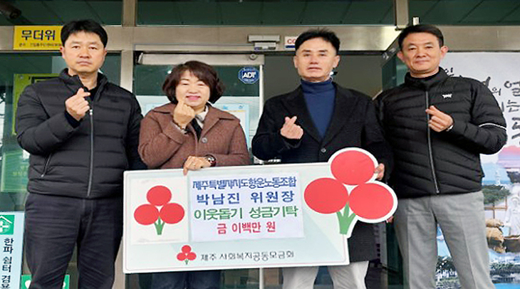 제주특별자치도 항운노동조합(위원장 박남진)은 지난 8일 건입동(동장 김미성)을 방문하여 어려운 이웃을 위해 사용해 달라며 성금 200만원을 기탁했다.