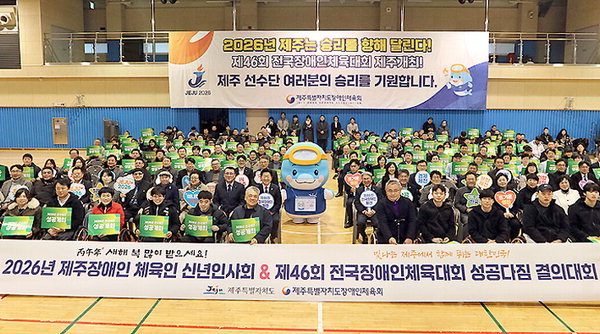 [한라일보] 제주특별자치도장애인체육회(회장 오영훈)는 지난 9일 2026년 병오년 신년인사회와 더불어 올해 제주에서 치러질 제46회 전국장애인체육대회 성공 다짐 결의대회를 개최했다.