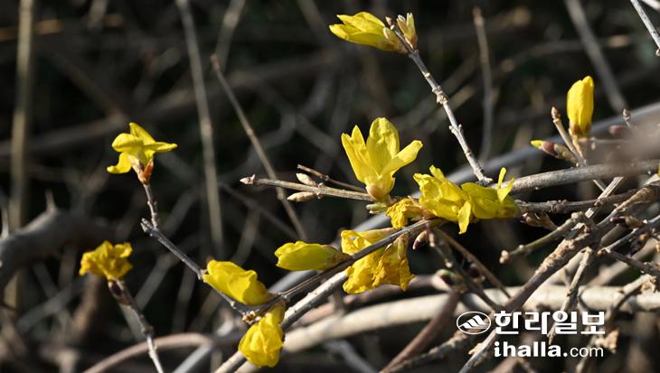 예년 기온을 되찾은 13일 제주시 오라동 도로변에서 개나리가 꽃망울을 터뜨려 눈길을 끌고 있다. 강희만기자