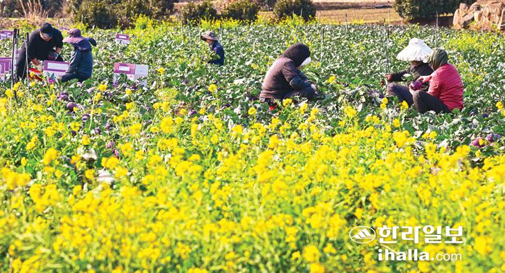활짝 핀 유채꽃향 맡으며 콜라비 수확하는 제주 농가. 한라일보DB