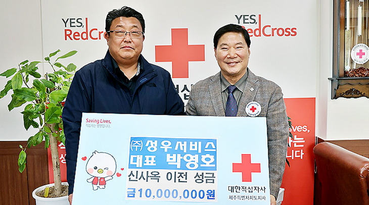 (주)성우서비스 박영호 대표가 최근 대한적십자사 제주도지사(회장 정태근)에 신사옥 이전 성금 1000만원을 기탁했다. 성금은 신사옥 이전과 함께 대한적십자사 인재개발원 제주캠퍼스 조성을 통해 재난재해 대응 역량을 강화하고 인도주의 활동의 지속 가능한 기반을 마련하는 데 사용될 예정이다.