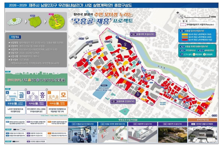 지난해 국토교통부의 '우리동네살리기 신규 공모사업'에 선정된 남문2지구에선 도시재생 기반을 구축하기 위한 사전 작업이 진행된다. 올해는 노후 주택 집수리 등을 위한 행정적 준비를 비롯해 주민 커뮤니티 센터인 '모흥마루', 마을 공원인 '모흥뜨락'을 갖추기 위한 실시설계가 이뤄진다. 남문2지구 사업은 '탐라국 발상지, 주민 모다정 누리는 모흥골 재흥'이라는 목표로 이도1동 1695-9 일대 약 6만9700㎡에서 추진되는 도시재생 사업이다.