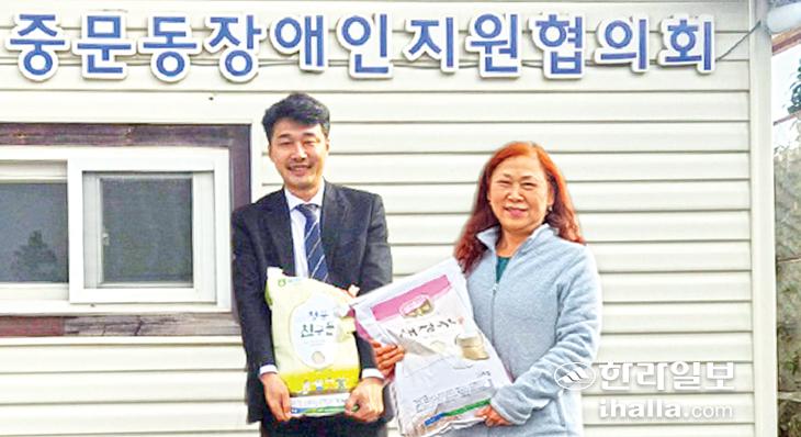 서귀포시 하원마을청년회는 지난 17일 열린 하원청년회장 이·취임식에서 축하의 뜻으로 전달받은 쌀 화환 가운데 쌀 470㎏를 중문동장애인협의회(회장 양지영)에 전달했다.