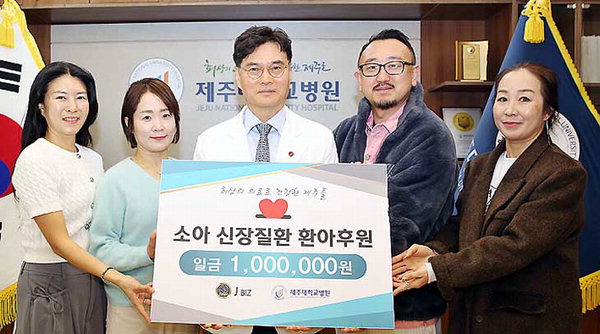 [한라일보] (주)제이비즈(대표이사 현승진)와 제주글로벌문화콘텐츠예술인협회는 '제8회 소아신장병 환우 돕기 자선행사'를 통해 모은 성금 100만원을 최근 제주대학교병원에 발전기금으로 전달했다.