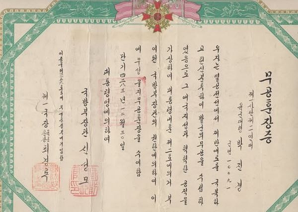 22일 한라일보가 확보한 국가기록원의 ‘을지무공훈장 훈기부’에 따르면 박 대령은 훈기번호 ‘J000356’에 해당하는 것으로 추정되며, 육군본부1사11연 소속으로 1950년 12월30일 ‘육이오참전유공’으로 을지무공훈장을 수여받았다.