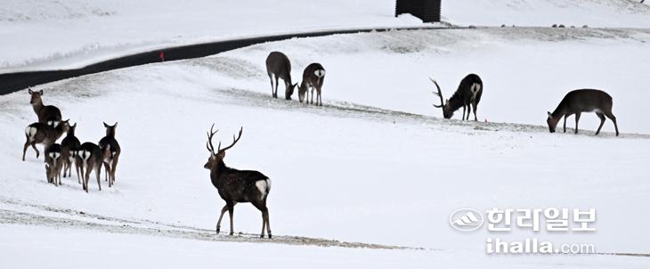 눈 쌓인 중산간에서 먹이 찾는 사슴. 한라일보DB