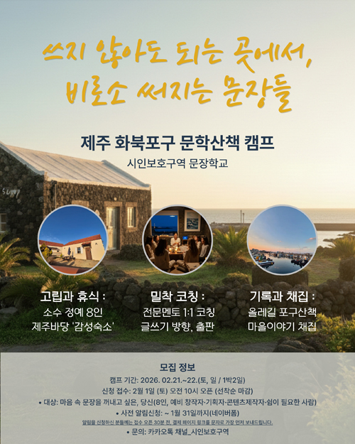 [한라일보] 문화콘텐츠그룹 시인보호구역이 오는 2월 21일부터 22일까지 1박2일간 '화북포구 문학 산책 캠프'를 운영한다.