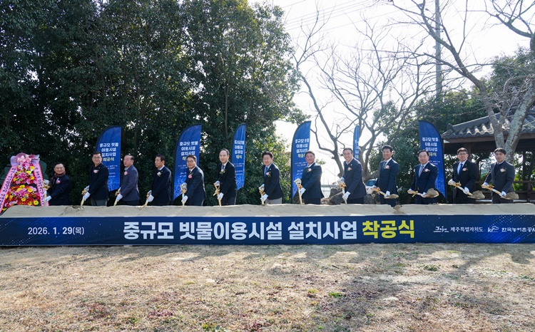 제주특별자치도는 29일 서귀포시 남원읍 위미의례회관에서 전국 최초로 빗물을 지역 단위로 모아 공급하는 '중규모 빗물이용시설 설치사업' 착공식을 열었다고 밝혔다. 이날 착공식에는 오영훈 제주도지사를 비롯해 기후에너지환경부, 도의회, 서귀포시, 한국농어촌공사, 시공사 관계자와 지역주민 등 200여 명이 참석했다.