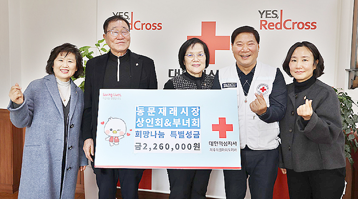 동문재래시장 상인회(회장 김원일)·부녀회(회장 박해례)는 최근 직접 만든 떡국을 판매해 얻은 수익금 226만원을 대한적십자사 제주도지사(회장 정태근)에 전달했다.