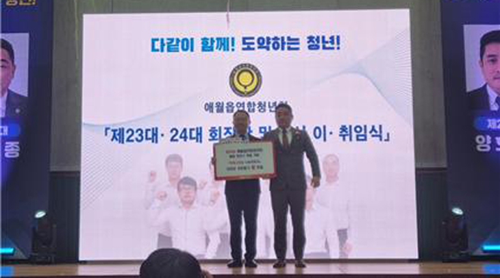 제주시 애월읍연합청년회(회장 양호근)는 지난 25일 애월읍체육관에서 개최된 '제23대·24대 청년회장단 이·취임식'에서 화환으로 받은 쌀(10㎏) 96포를 애월읍(읍장 김태헌)에 기탁했다.
