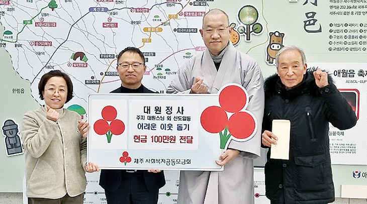 대한불교법화종 대원정사(주지 대원스님) 신도 일동은 지난달 27일 제주시 애월읍사무소(읍장 김태헌)를 방문해 십시일반 모은 이웃돕기 성금 100만원을 기탁했다.