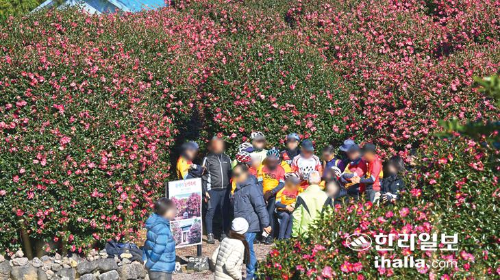 활짝 핀 애기동백 만끽하는 관광객. 한라일보DB