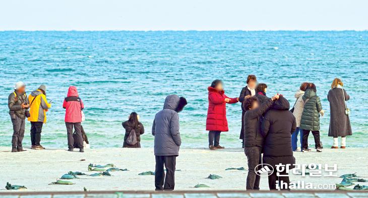 [한라일보] 3일 제주시 조천읍 함덕해수욕장 백사장에 많은 관광객들이 찾아 제주의 겨울바다를 즐기고 있다. 강희만기자