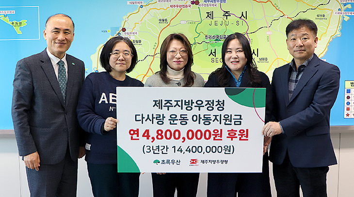 제주지방우정청(청장 직무대리 고영호)은 지난 3일 초록우산 제주지역본부(본부장 김희석)와 도내 취약계층 청소년 가정을 위한 '다사랑 모금액' 정기후원금 전달식을 가졌다.