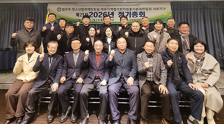 법무부 청소년범죄예방위원 제주지역협의회 자원봉사분과위원회 서부지구(지구회장 양성윤)는 지난 2일 노팅힐웨딩컨벤션에서 고영두 회장, 양성훈 운영실장, 양방훈 운영처장 등 지구위원 30여 명이 참석한 가운데 정기총회를 개최했다. 이날 2025년 사업보고와 2026년 사업계획을 승인했다.