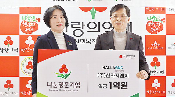 [한라일보] (주)한라지엔씨(대표이사 김신성·김혜란)은 지난 4일 제주사회복지공동모금회에 1억원 이상을 일시기부하거나 5년 이내 기부를 약정하는 기업을 대상으로한 나눔명문기업에 제주 21호로 가입했다.