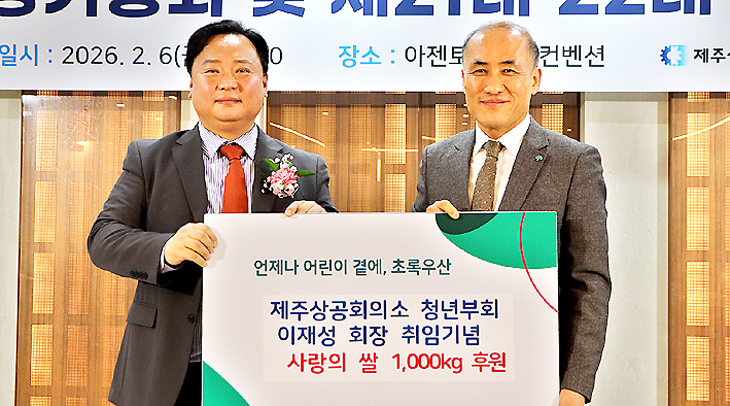 제주상공회의소 청년부회(회장 이재성)는 지난 6일 제주아젠토피오레컨벤션에서 회장 이·취임식에서 받은 사랑의 쌀 1000㎏을 초록우산 제주지역본부(본부장 김희석)에 전달했다. 쌀은 제주시 내 취약계층 아동 관련 시설들에 전달될 예정이다.