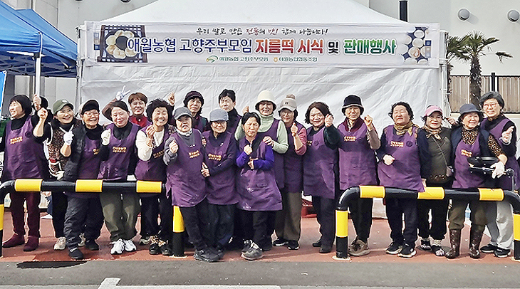 애월농협(조합장 김병수) 고향주부모임(회장 정순여)은 지난 15일 설 명절을 맞아 조합원과 내방 고객을 대상으로 제주 향토음식 '지름떡' 시식·판매 행사를 진행했다.