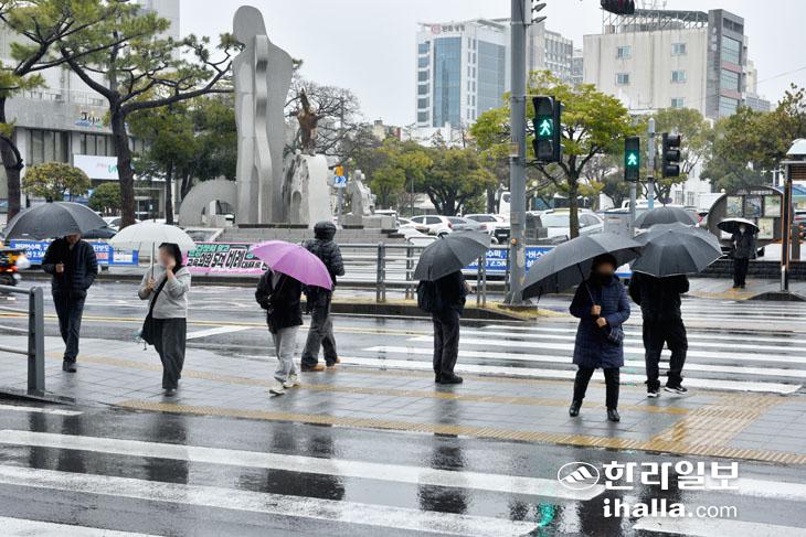 [한라일보] 강풍특보와 함께 비가 내린 24일 시민들이 우산을 쓴채 제주시청 앞길을 걸어가고 있다. 제주기상청은 25일까지 강풍이 불 것으로 예보했다. 장태봉기자