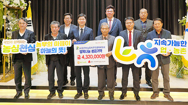 (사)한국새농민 제주특별자치도회(회장 김종우)는 지난달 27일 노팅힐웨딩컨벤션에서 이웃사랑 성금 432만원을 제주사회복지공동모금회(회장 강지언)에 기탁했다.