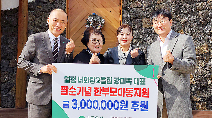 초록우산 제주지역본부(본부장 김희석)는 지난달 28일 제주시 구좌읍 월정리에 소재한 너와랑2층집 강미옥 대표로부터 팔순을 기념해 마련한 아동후원금 300만원을 전달받았다.