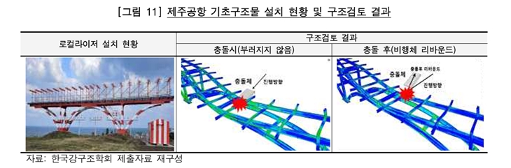 그러나 제주공항에 설치된 H빔 철골구조물은 항공기와 충돌시 부서지지 않을 뿐만 아니라, 사고 충격으로 구조물이 항공기 진행하는 반대 방향으로 튕겨져 나와 승객에게 큰 충격을 가하는 것으로 조사됐다. H빔은 항공기와 충돌하면 오히려 기체를 덮쳐 사고 피해를 키운다는 뜻이다.