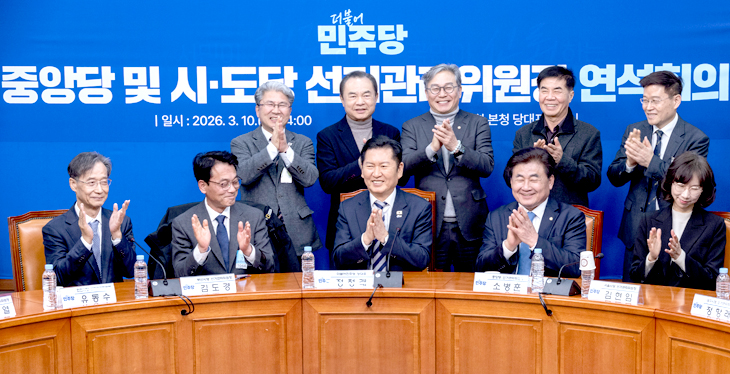 더불어민주당 정청래 대표(아래 줄 왼쪽 세 번째부터), 소병훈 중앙당 선관위원장을 비롯한 전국 시ㆍ도당 위원장들이 10일 국회에서 열린 중앙당 및 시ㆍ도당 선거관리위원장 연석회의에 참석해 기념 촬영을 하고 있다. 연합뉴스