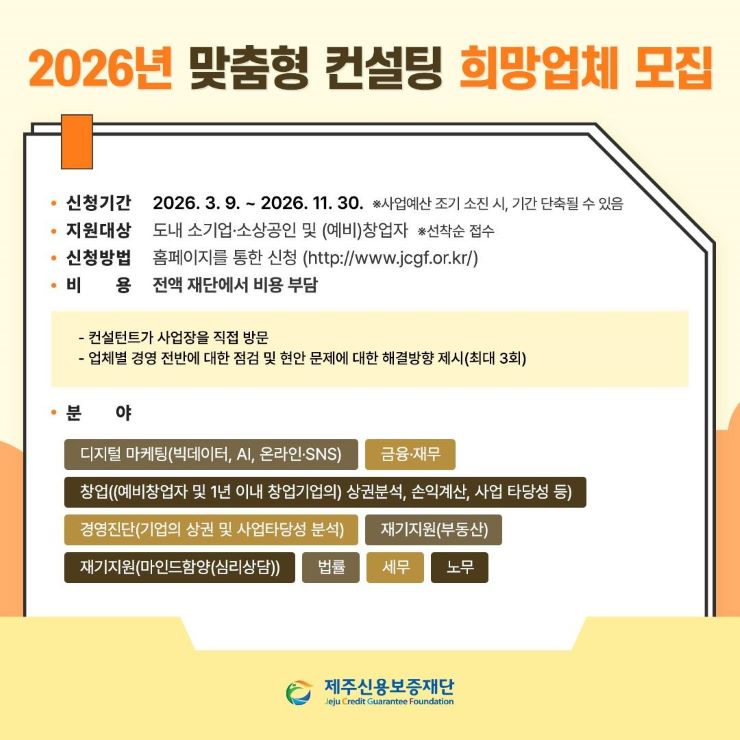 재단은 '2026년도 맞춤형 컨설팅 사업'에 참여할 희망 업체를 지난 9일부터 모집하고 있다고 11일 밝혔다. 지원 대상은 도내 소기업·소상공인과 (예비)창업자다.