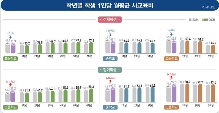 지난해 전국 전체학생의 1인당 월평균 사교육비는 45만8000원으로, 역대 가장 많았던 2024년(47만4000원)에 견줘 3.5% 줄었는데, 2020년(-6.0%) 이후 5년 만의 감소다.