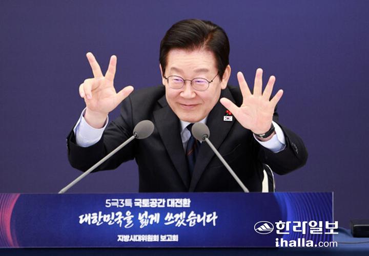 이재명 대통령이 지난해 12월 용산 대통령실에서 열린 지방시대위원회 보고회에서 '5극 3특'을 의미하는 손가락을 펴보이고 있다.연합뉴스