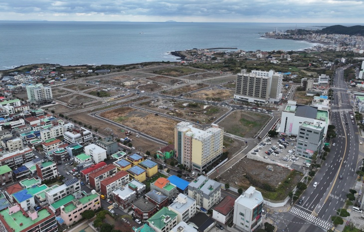 매각됐다 회수된 제주시 화북상업지역 주상복합용지에 대한 재매각이 이뤄진다. 당초 2660억원에 팔렸던 해당 용지가 800억원대로 몸 값을 낮추면서 매각이 이뤄질지 관심이 쏠리고 있다. 화북상업지역 전경. 제주시 제공