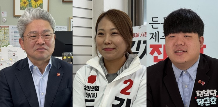 사진설명=왼쪽부터 더불어민주당 강철남 의원, 국민의힘 김지은 예비후보, 진보당 정근효 예비후보.