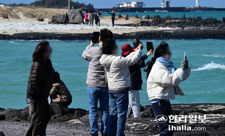 [한라일보] 19일 제주시 한림읍 협재해수욕장을 찾은 관광객들이 사진을 촬영하며 제주에서의 추억을 새기고 있다. 강희만기자