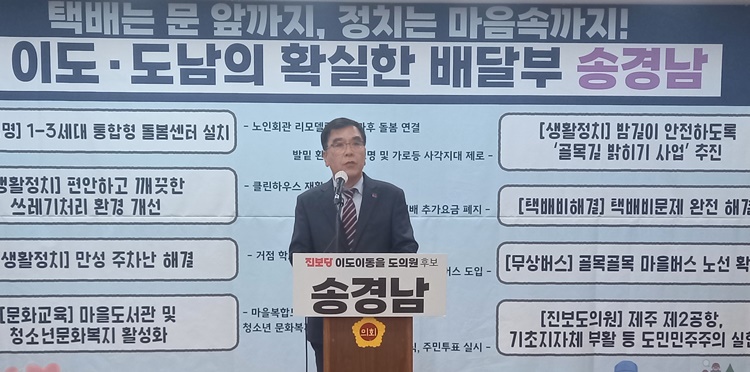 진보당 송경남 예비후보가 23일 제주도의회 도민카페에서 기자회견을 열었다. 오소범 기자