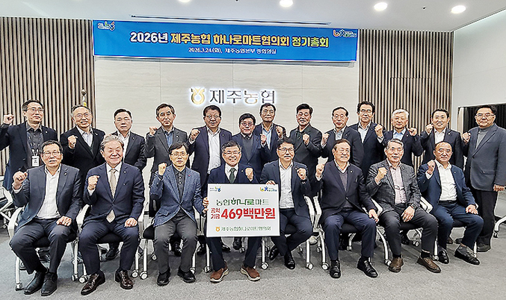 제주농협 하나로마트협의회(회장 정기철, 서귀포농협 조합장)는 지난 24일 제주농협본부 회의실에서 도내 농·축협 조합장 17명이 참석한 가운데 2026년 정기총회를 열고, 지역사회 나눔 실천을 위한 공익기금 전달식을 가졌다. 이날 정기총회에서는 2025년 회계결산 승인과 2026년도 사업계획을 수립했으며, 하나로마트 수익금의 일정액(0.4%)으로 조성한 공익기금 4억6900만원을 제주사회복지공동모금회(회장 강지언)에 기탁했다.