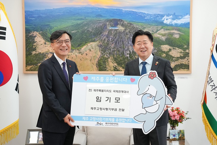 오영훈 제주지사가 27일 집무실에서 임기모 전 국제관계대사에게 명예도민증을 수여했다. 제주도 제공