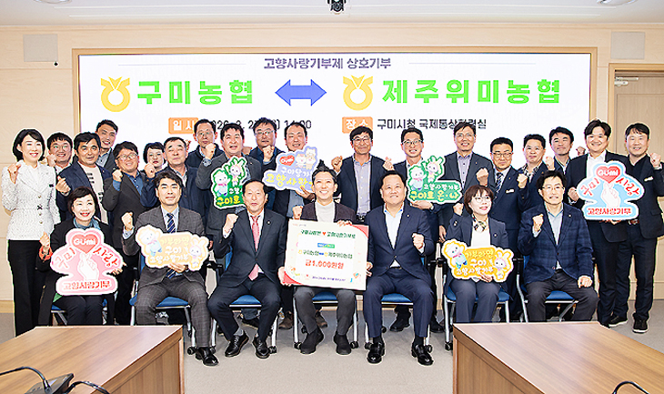 [한라일보] 서귀포시 남원읍(읍장 고권우)은 지난 27일 경북 구미시청에서 제주 위미농협(조합장 현재근)과 경북 구미농협(조합장 이전광) 간의 '고향사랑 상호기탁식'을 개최했다. 이날 구미농협 임직원 100명은 서귀포시에 고향사랑 기부금 1000만원을 기탁했고, 해당 기부금은 서귀포시의 지정기탁사업 '펫트립in서귀포'의 재원으로 활용된다.