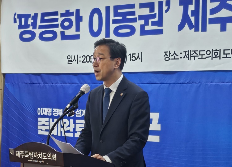 위성곤 의원은 31일 제주도의회 도민카페에서 기자회견을 열고 '제주형 교통 체계 혁신' 공약을 발표했다. 오소범 기자
