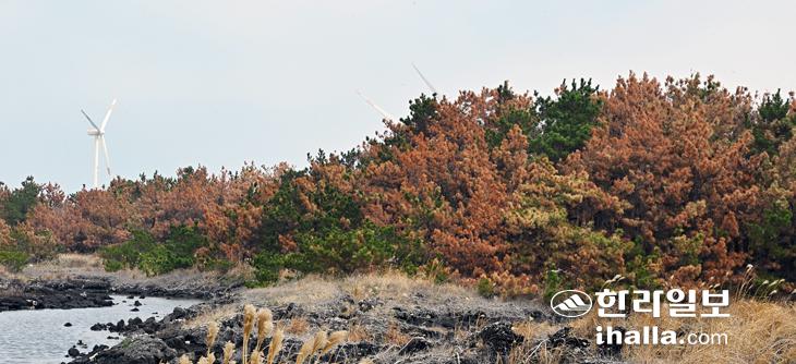 [한라일보] 31일 제주시 한경면 일대의 소나무가 솔껍질깍지벌레와 냉해 피해로 누렇게 말라 죽어가고 있다.
