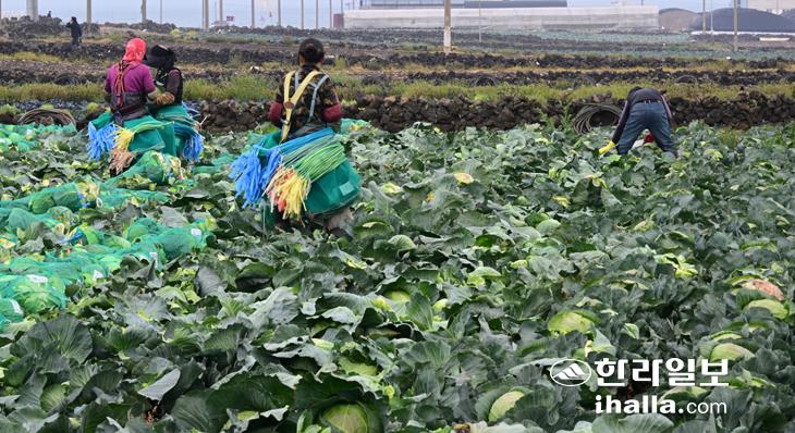 [한라일보] 지난달 31일 제주시 한림읍 수원리 농경지에서 농민들이 양배추 수확 작업을 하고 있다.