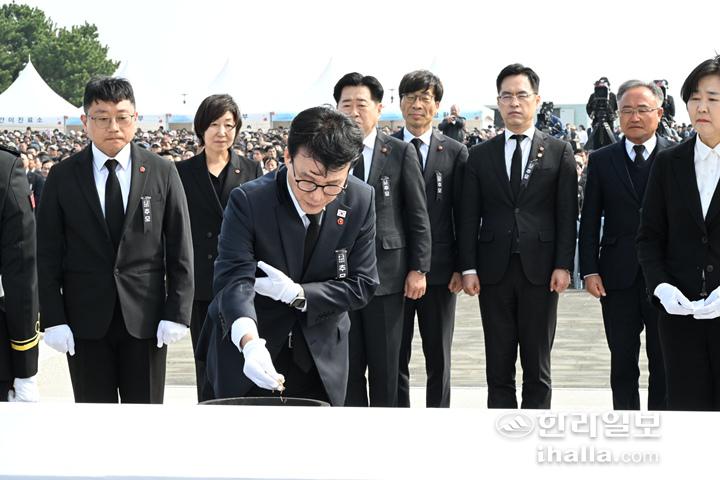 [한라일보] 김민석 국무총리가 3일 제주 4·3 평화공원에서 열린 제78주년 제주 4·3 희생자 추념식에서 분향하고 있다.
