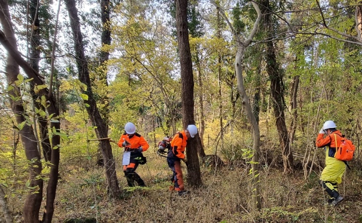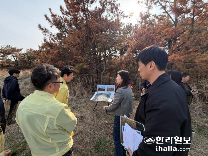산림청과 제주도 한라산연구부, 제주시가 한경면 일대의 소나무 등 솔껍질깍지벌레 피해목에 대해 합동 점검하고 있다. 제주시 제공