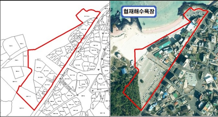 지적재조사사업 대상지인 협재해수욕장 인근으로 주차장을 포함한 협재리13지구. 제주시 제공