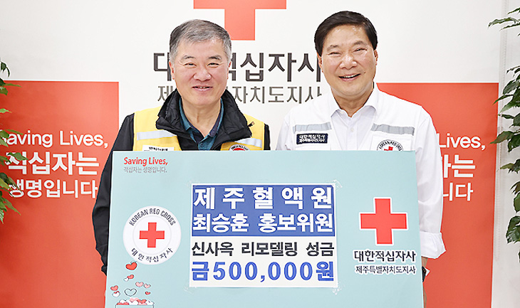 대한적십자사 제주특별자치도혈액원(원장 임정한) 최승훈 헌혈홍보위원은 대한적십자사 제주특별자치도지사(회장 정태근)에 신사옥 리모델링을 위한 성금 50만원을 기탁했다.