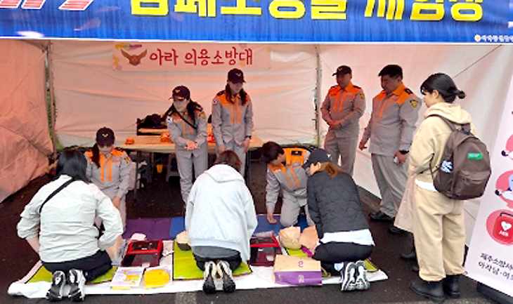 제주소방서 아라의용소방대(대장 김형훈·백행자)는 지난 4~5일 제주대학교 일대에서 열린 '2026 아라가족 제대로 놀장' 행사장에서 심폐소생술 부스를 운영했다.