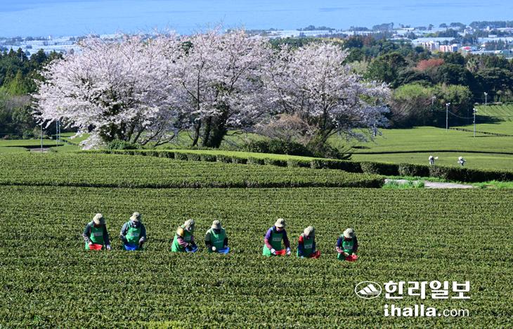 [한라일보] 8일 서귀포시 도순동 아모레퍼시픽 돌송이차밭에서 농민들이 햇차를 수확하고 있다.