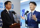 12일 군위오씨입도시조 묘역에서 만난 오영훈, 위성곤 후보.